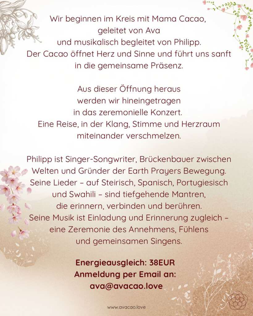 Mit einer Tasse Cacao öffnen wir Herz und Sinne. Musik, Stimme und Tanz führen uns zurück in die lebendige Bewegung des Seins.